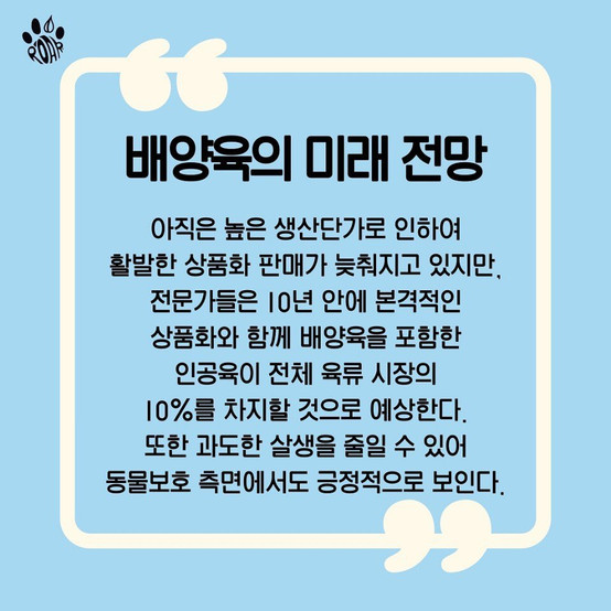 아직은 높은 생산 단가로 인하여 활발한 상품화 판매가 늦춰지고 있지만, 전문가들은 10년 안에 본격적인 상품화와 함께 배양육을 포함한 인공육이 전체 육류 시장의 10%를 차지할 것으로 예상한다. 또한, 과도한 살생을 줄일 수 있어 동물보호 측면에서도 긍정적으로 보인다.